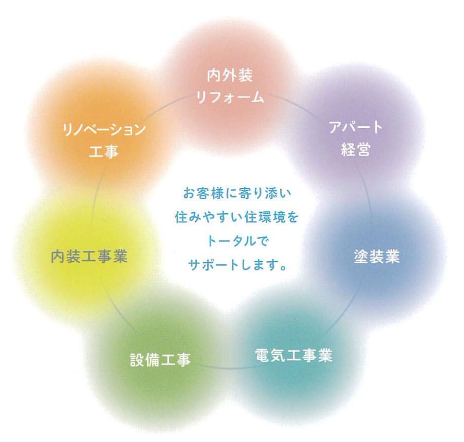 当社は2001年の創業以来、建物清掃業やアパート・マンションの原状回復工事を中心に、内外装リフォーム、リノベーション工事、設備工事、電気工事、塗装業、アパート経営など、多岐にわたるサービスを提供してまいりました。私たちは、社会に貢献し、顧客満足を追求することを経営理念とし、地域社会に密着した企業として成長を続けています。